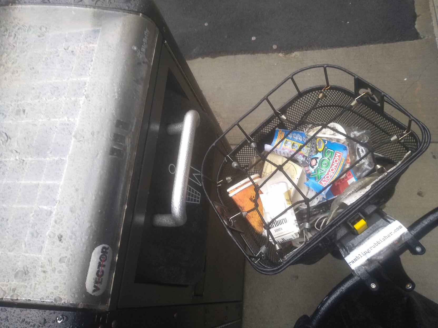 A basket of litter plicykled (picked up while bicycling without stopping) off the streets and paths of #Boston on a Monday evening ride and dumped at the corner of Montgomery and Dartmouth. #plicykling #Biketooter
