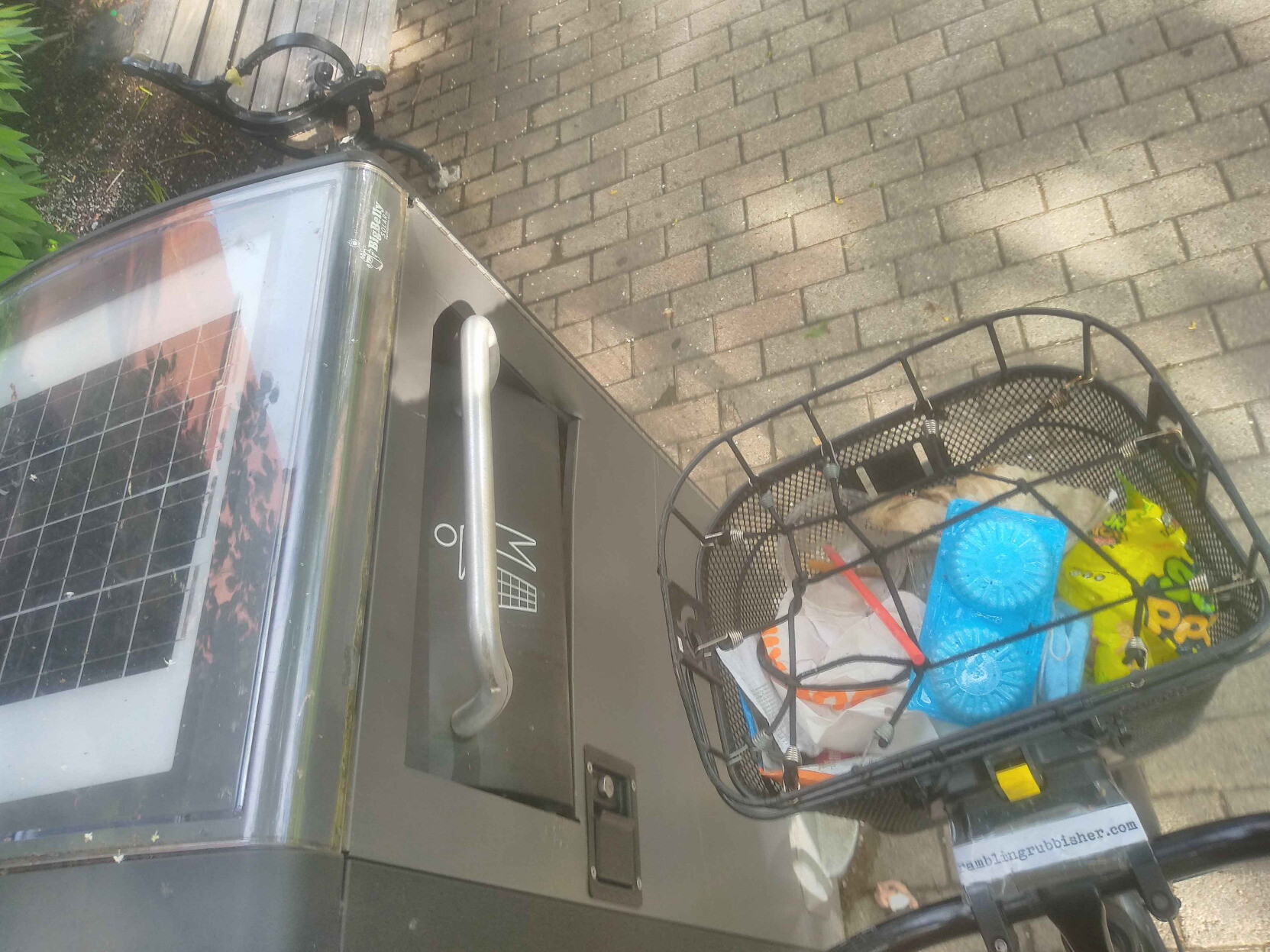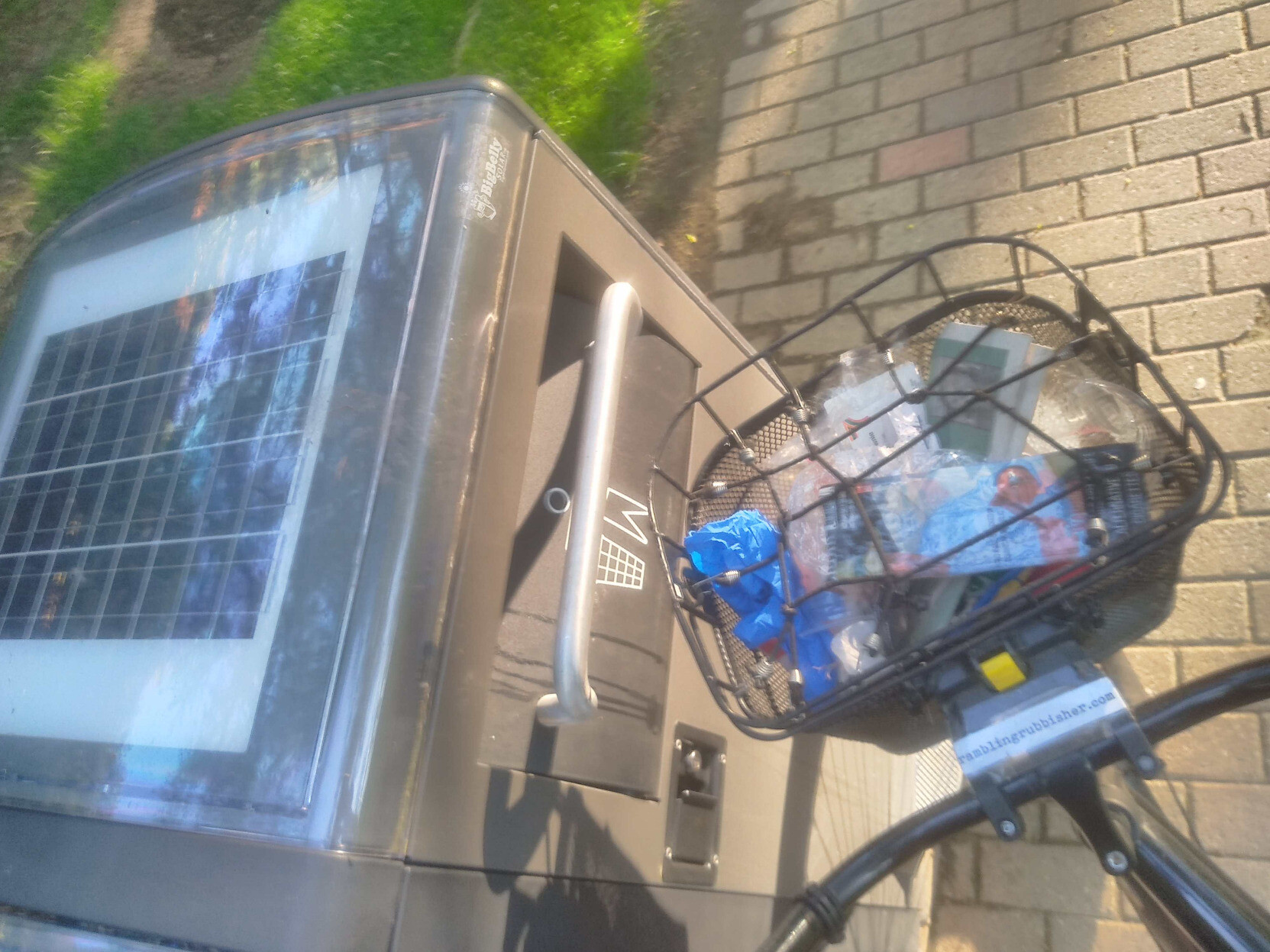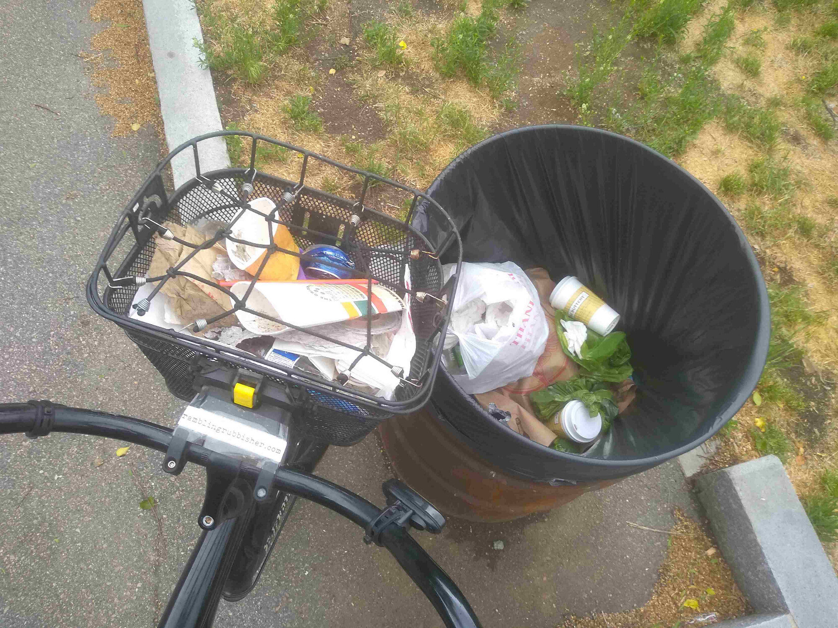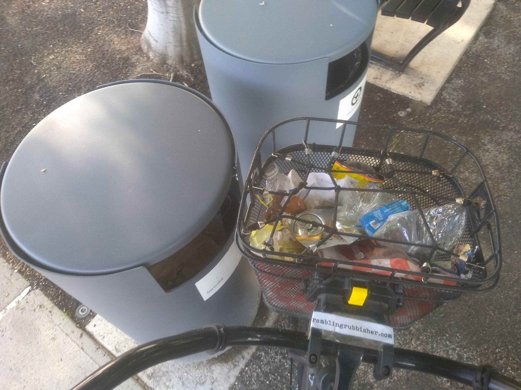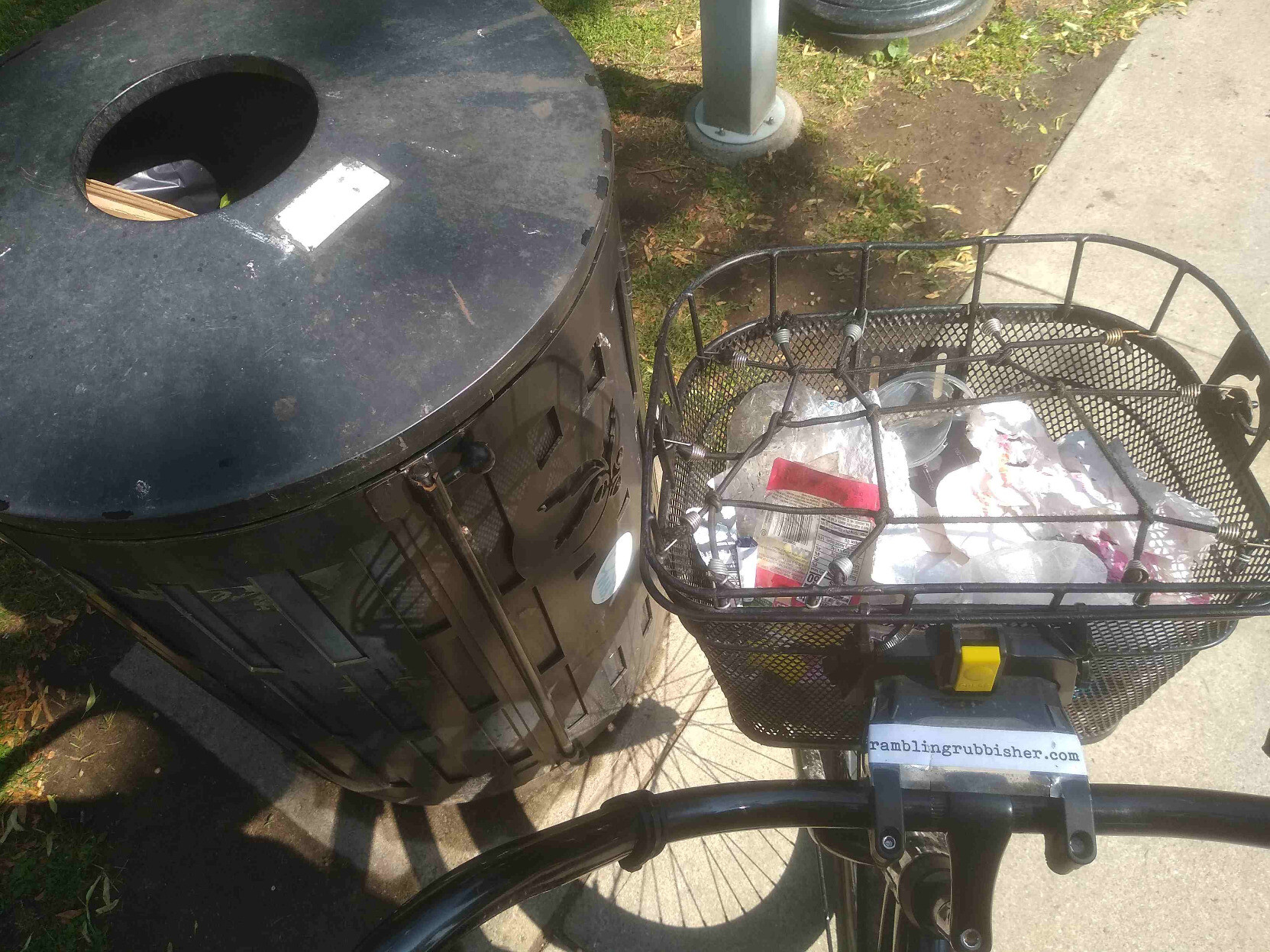 A basket of litter plicykled (picked up while bicycling without stopping) off the streets and paths of #Boston on a Saturday evening ride and dumped in Adams Park in Roslindale. #plicykling #Biketooter