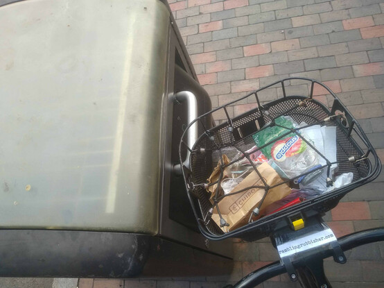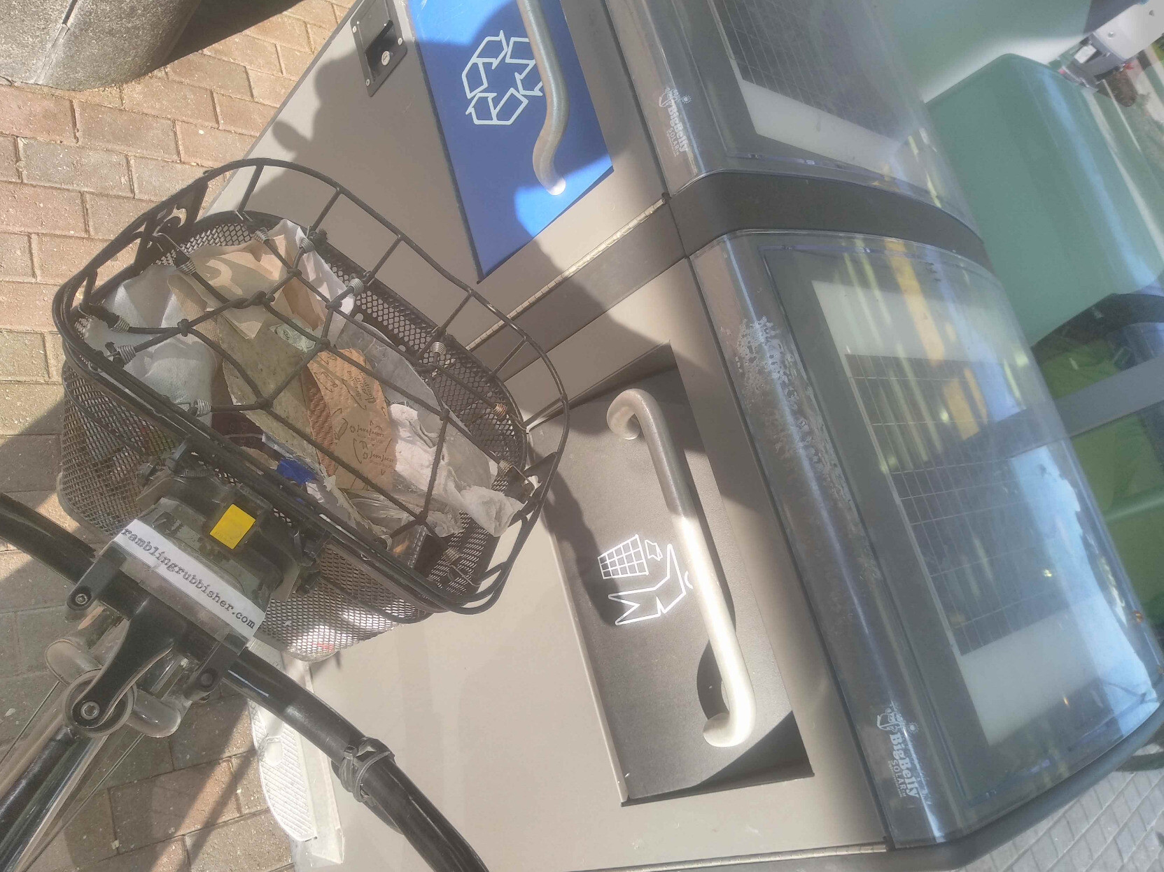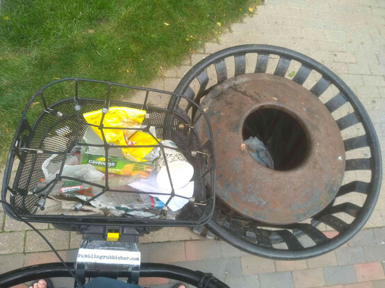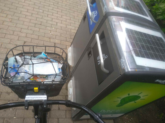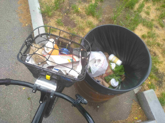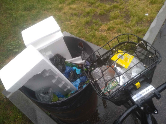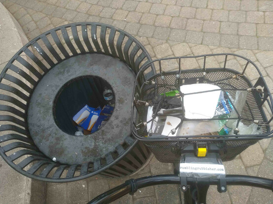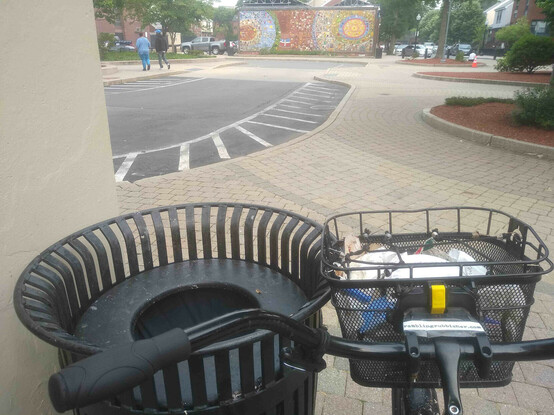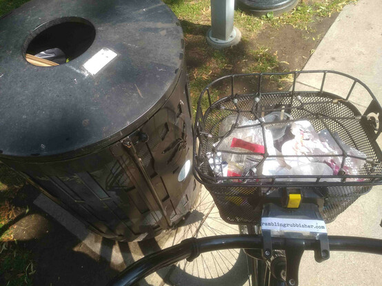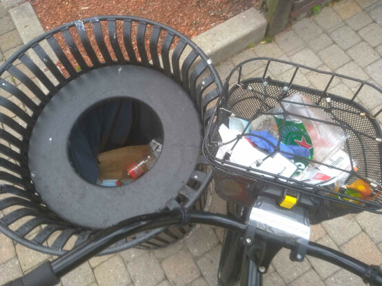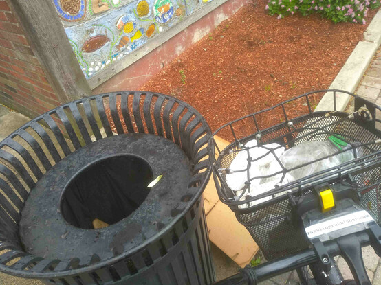 A basket of litter plicykled (picked up while bicycling without stopping) off the streets of #Boston on a Sunday evening ride and dumped in bin three of four* at the Dr. Kenneth C. Edelin Square. #plicykling #Biketooter