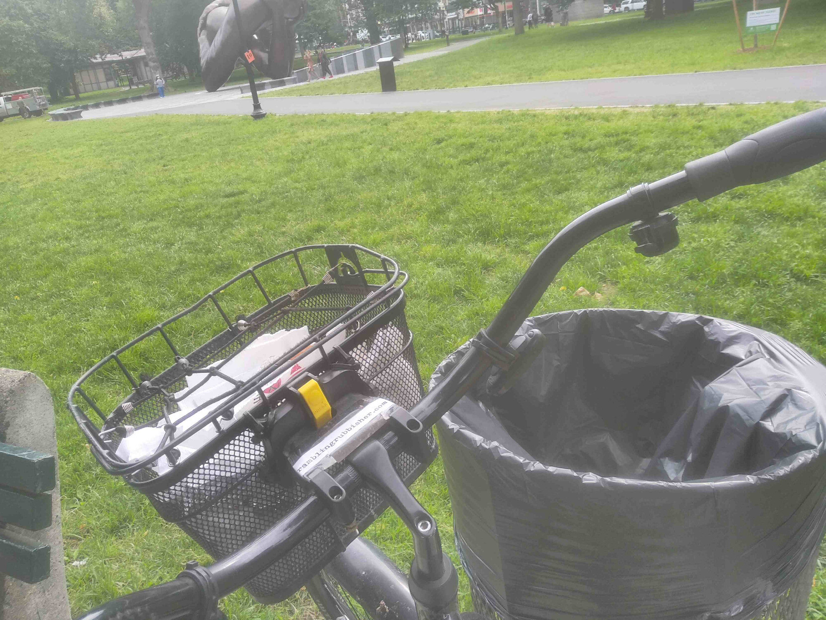 A basket of litter plicykled (picked up while bicycling without stopping) off the streets of #Boston on a Tuesday morning ride and dumped in the Common with "The Embrace" in the background. #plicykling #Biketooter