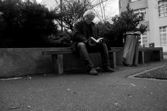 28/12/2012. Autoportrait en lecteur sur sa pause méridienne sur le petit banc à quelques encablures seulement de l'open space, je viens tout juste d'avoir 48 ans et je lis "La Perte de l'image" de Peter Handke.