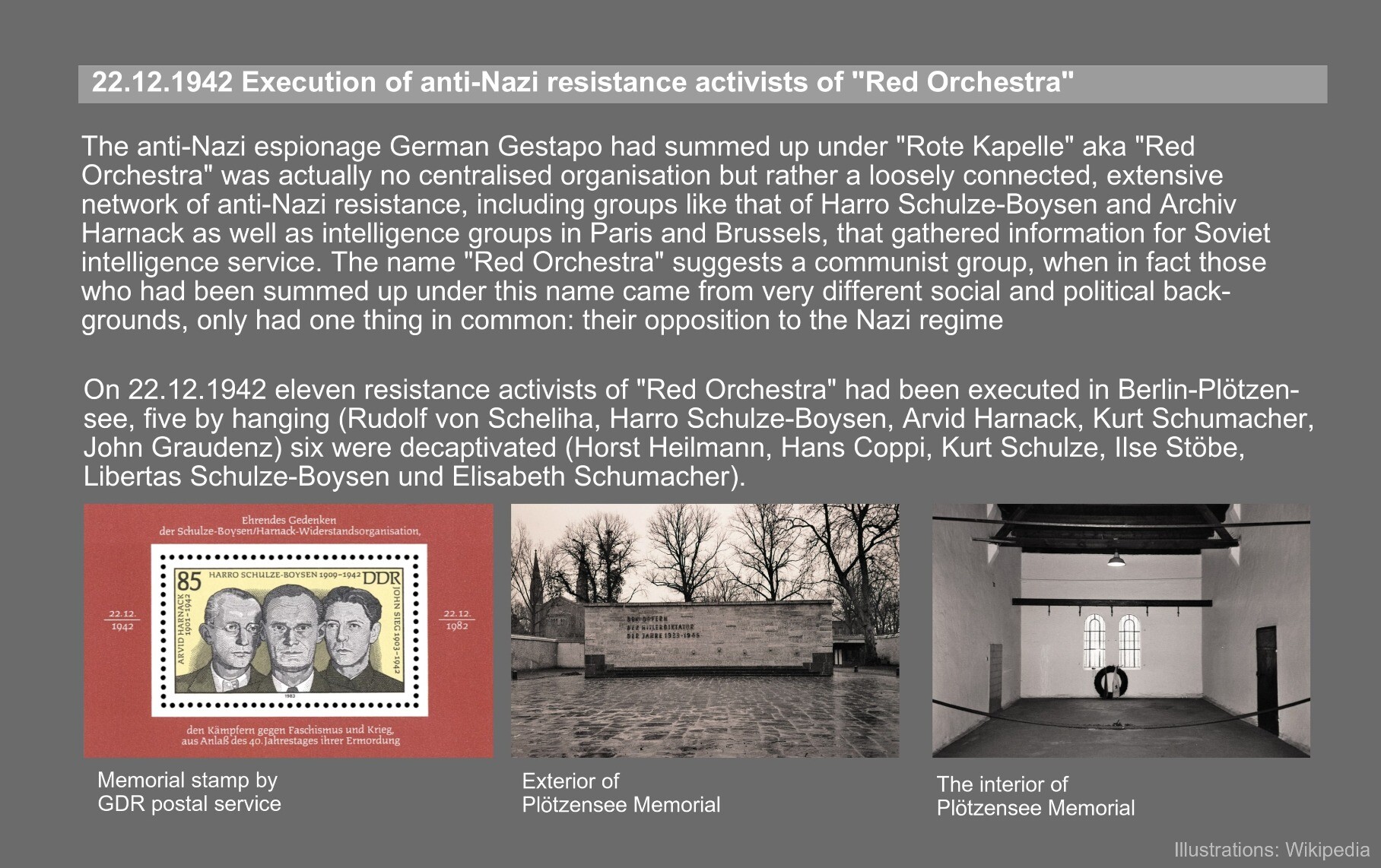 22.12.1942 Execution of anti-Nazi resistance activists of "Red Orchestra" in Berlin-Plötzensee.