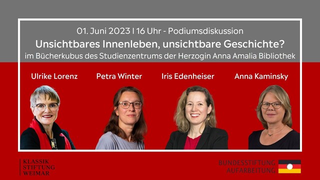 Am 01. Juni findet die #Podiumsdiskussion „Unsichtbares Innenleben, unsichtbare Geschichte?“ mit Dr. Iris Edenheiser, Dr. Anna Kaminsky, Dr. Ulrike Lorenz und Dr. Petra Winter ab 16 Uhr im Bücherkubus der HAAB statt. Alle Interessierten sind herzlich eingeladen!