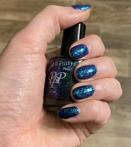 Tonight’s #nailpolish is Paint It Pretty’s 10,000 Years Will Give You Such a Crick in the Neck from the October #PolishPickUp - it’s a jelly with flakes, and it’s so gorgeous but it also took like 3-4 topcoat layers to get those flakes to lay down smooth. Also I was a little sloppy with the application because I was doing my annual ethics training at the time.