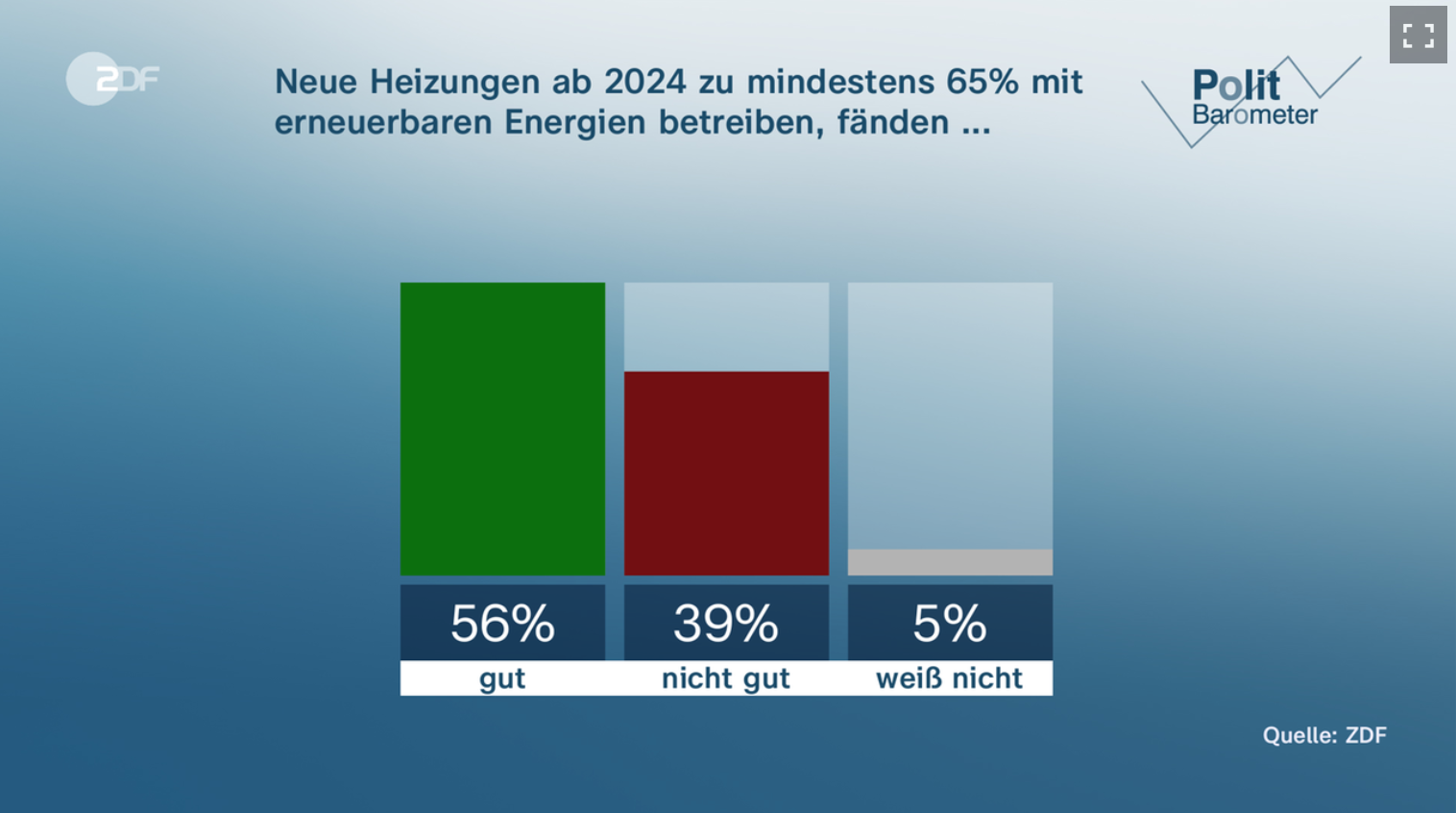 Interessante Zahl zum #Heizungsgesetz aus dem neuen #Politbarometer: 56 Prozent finden es gut, dass neue Heizungen ab 2024 zu mindestens 65 Prozent erneuerbarer Energie betrieben werden sollen. https://www.zdf.de/nachrichten/politik/politbarometer-projektion-heizungen-gefluechtete-100.html
