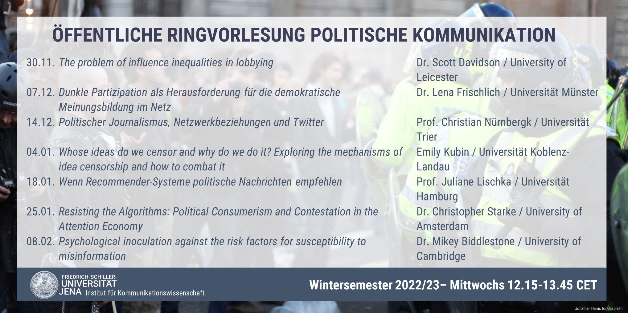Our public lecture series on #politicalcommunication is starting on Wednesday with a talk by Dr. Scott Davidson. Feel free to join. ⏰12:15 CET 💻 via https://uni-jena-de.zoom.us/j/66190566226 Code 791117 👇🏼