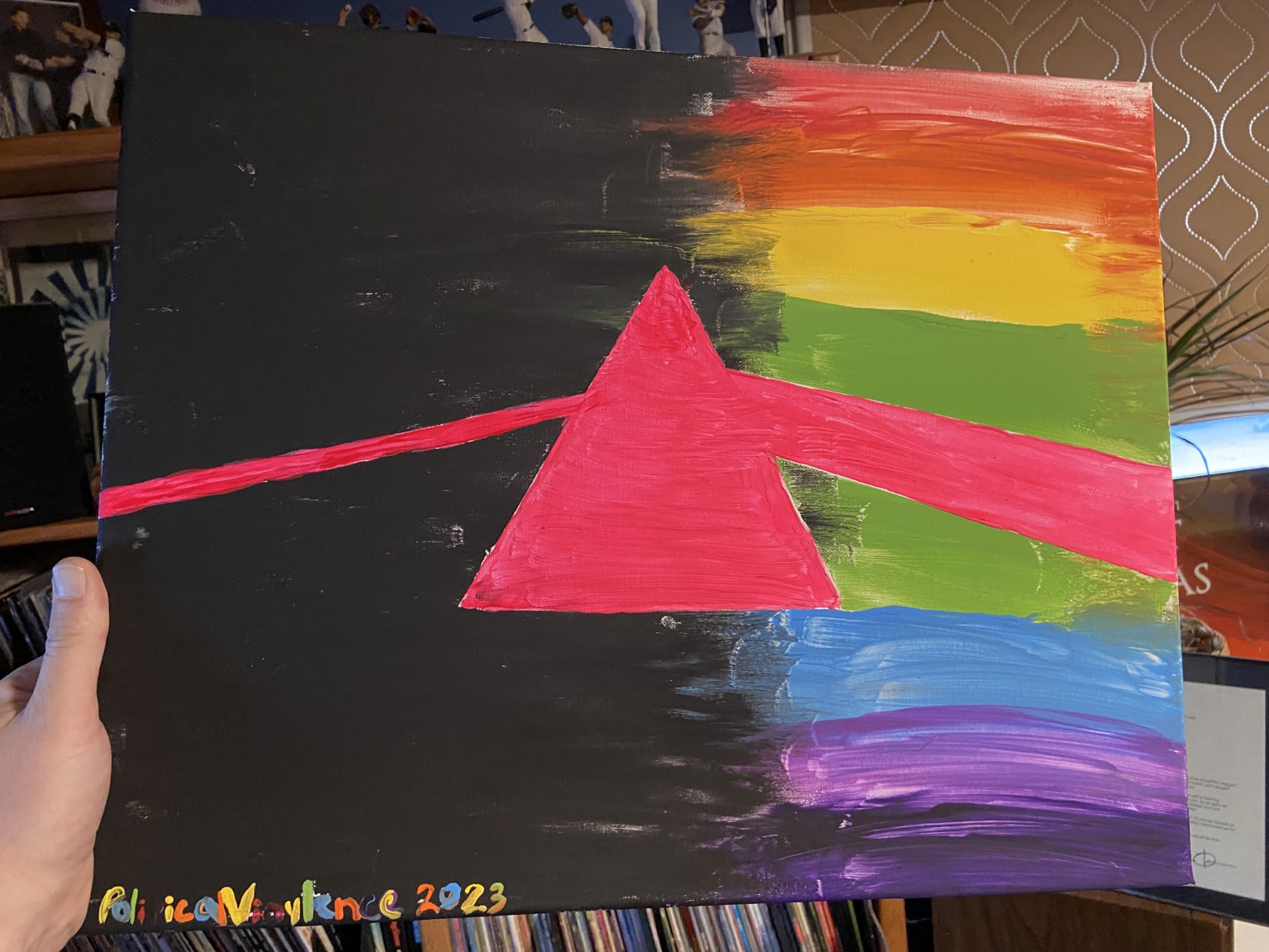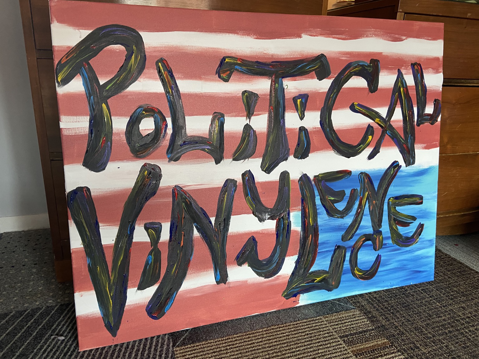 Needed a logo piece to go front center for the rest of my work for the art walk in June. So I painted this on my livestream today. It should get people talking about the rest of my art. Did I mention I live in a red state and a mostly red town? Paint is still drying 😁 #PoliticalVinylence