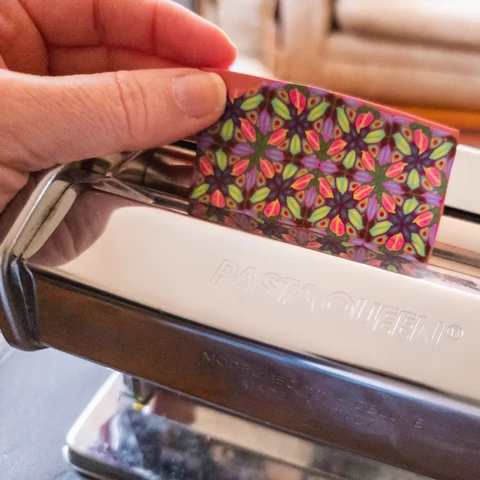 #aMonthofMaking days 07/31 and 08/31: making a kaleidoscopically patterned sheet in polymer clay for #PDCseamRippers, and joining the purple yarn in my #PDChorizontalHold wrap.