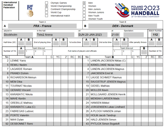 La feuille de match de la finale entre la France et le Danemark #FRADAN #POLSWE2023