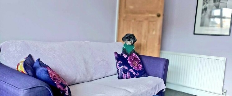Here's a photo of my toy poodle Freddie. He loves to sit on the cushions to get a good view out of the window. Look at all the couch he's missing out on π