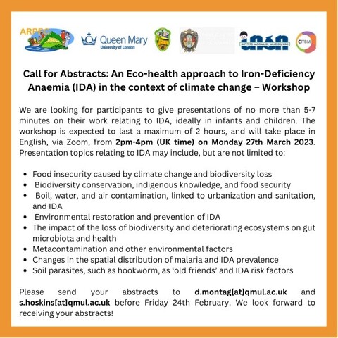 Dr. Doreen Montag, Senior Lecturer in Global Public Health at Queen Mary University of London, asked me to circulate this call for abstracts from those interested in presenting at a workshop on An Eco-health Approach to Iron-Deficiency Anemia (IDA) in the context of climate change on March 27, from 2-4 pm. I've attached the circular, but the gist is that possible areas may include food insecurity due to climate change/biodiversity loss, indigenous knowledge, urbanization and sanitation, deteriorating ecosystems and gut microbiota and various others.