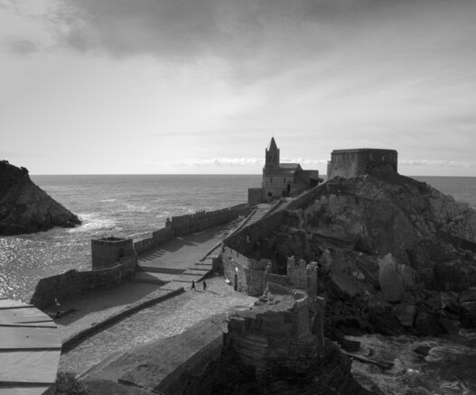 Porto Venere, the promontory with the church of San Pietro. Outside the tourist season, two visitors make their way to the overlook of Lord Byron's Cave.