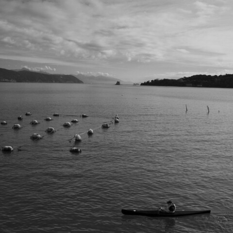 Porto Venere, the gulf of poets. A canoe crosses a stretch facing the coast where the fishermen's buoys are moored, in the distance the decaying Scola tower.