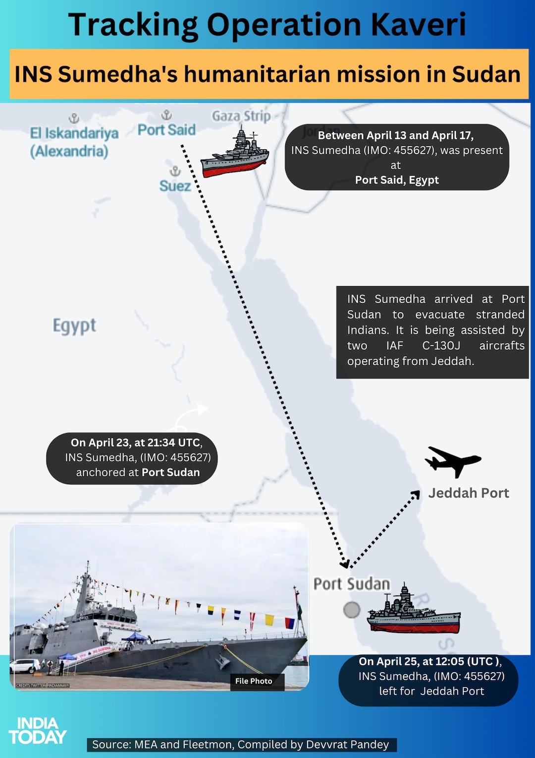 "As #OperationKaveri led by #INSSumedha gets underway from #PortSudan to #Jeddah in #SaudiArabia, India Today uses satellite imagery and open-source tools to map its journey that is bringing back citizens stranded in the violence-hit region."