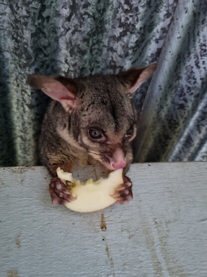 A happy brushtail enjoying a pear. It's been a really hot day, so I'd say the juicy pear hit the spot. She is now out on possum business, but sure she will be back in her tray by morning.
