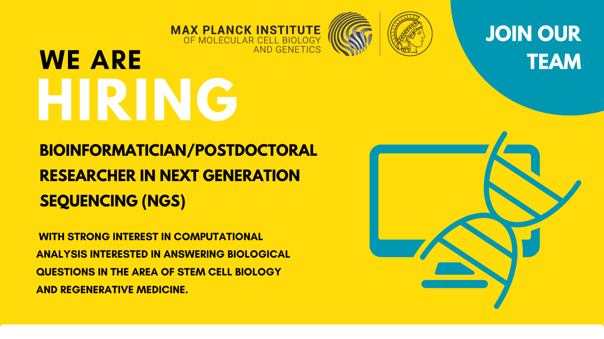 We are looking for a Bioinformatician/Postdoctoral Researcher in Next Generation Sequencing (NGS) with a PhD in Bioinformatics or a biologist with strong interest in computational analysis interested in answering biological questions in the area of stem cell biology and regenerative medicine. https://www.mpi-cbg.de/join-us/open-positions/job-offer/bioinformatician-postdoctoral-researcher-in-next-generation-sequencing-ngs #postdocjob #bioinformatics