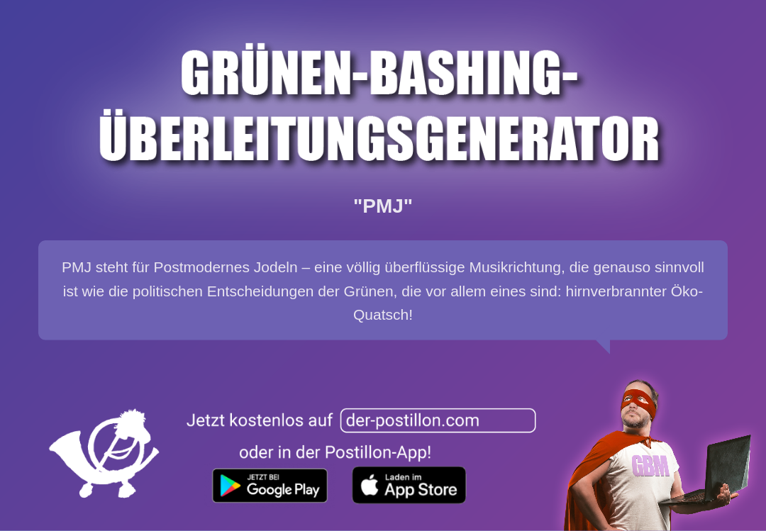 Mit dem Überleitungsgenerator hat der #postillon ein witziges KI-Tool geschaffen, dass bei jedem banalen Thema vom Thema ablenkt, indem es zu den #grünen überleitet, die oft nichts damit zu tun haben.