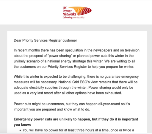 Just had an email from #UK Power Networks warning about possible #PowerCuts. This is the first *official* comms I have seen that talk about the possibility of rolling blackouts and explaining the block rota system. Kinda feels as though they have an expectation of needing to use it soon - especially given they are sending the comms out on a Sunday...