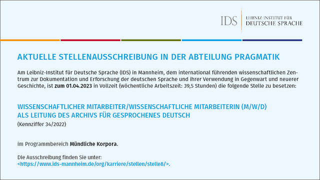 Aktuell ist in unserer Abteilung #Pragmatik eine Stelle als Wissenschaftlicher Mitarbeiter/Wissenschaftliche Mitarbeiterin (m/w/d) als Leitung des Archivs für Gesprochenes Deutsch zu besetzen! 🗣🗄 https://www.ids-mannheim.de/org/karriere/stellen/stelle8/ Wir freuen uns auf Ihre #Bewerbung! Gern teilen. #Stellenausschreibung #Jobs