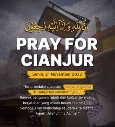 Mari menunduk sejenak & berdoa agar saudara2 kita yg terdampak gempa di Cianjur & sekitarnya mendapat ketabahan, kesabaran & kekuatan dari Allah.. ๐๐ผ๐๐ผ