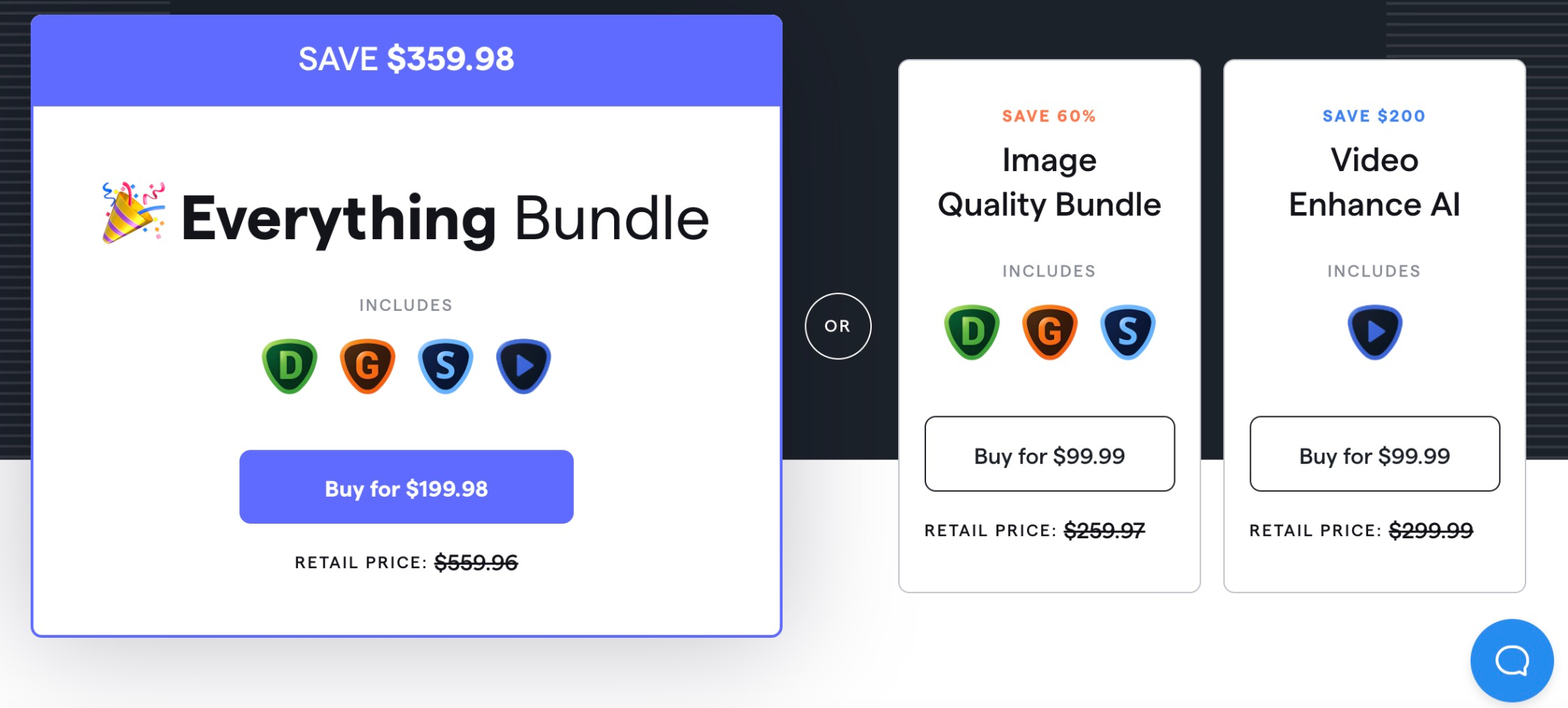 65% discount on Topaz Everything Bundle with DeNoise AI, Gigapixel AI, Sharpen AI, Video Enhance AI for 200$. 66% discount on Topaz Video Enhance AI for 100$. 60% on Topaz Image Quality Bundle with DeNoise AI, Gigapixel AI, Sharpen AI for 99$.