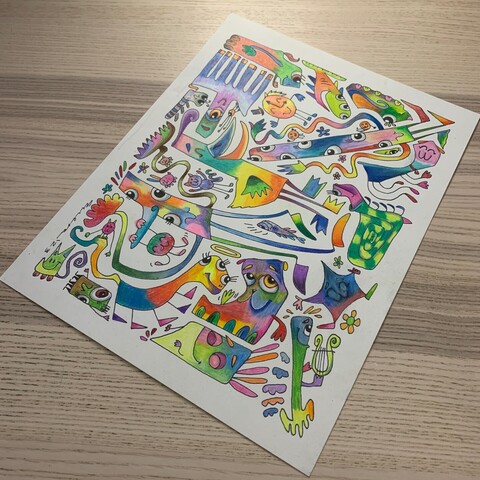 i printed the sheet on card stock paper and we colored it primarily with prismacolor colored pencils. the image has a of cute, weird characters and i’ve used all sorts of colors (yellows, reds, blues, pinks, etc).