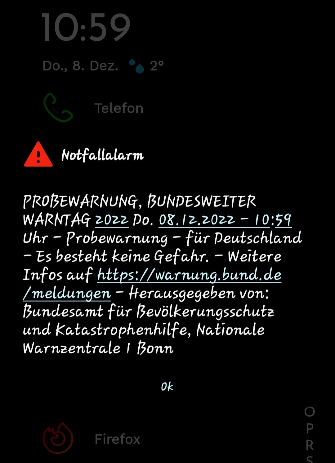 Do. 08.12.2022 - 10:59 Uhr - Probewarnung - für Deutschland - Es besteht keine Gefahr. - Weitere Infos auf https://warnung.bund.de/ meldungen - Herausgegeben von: