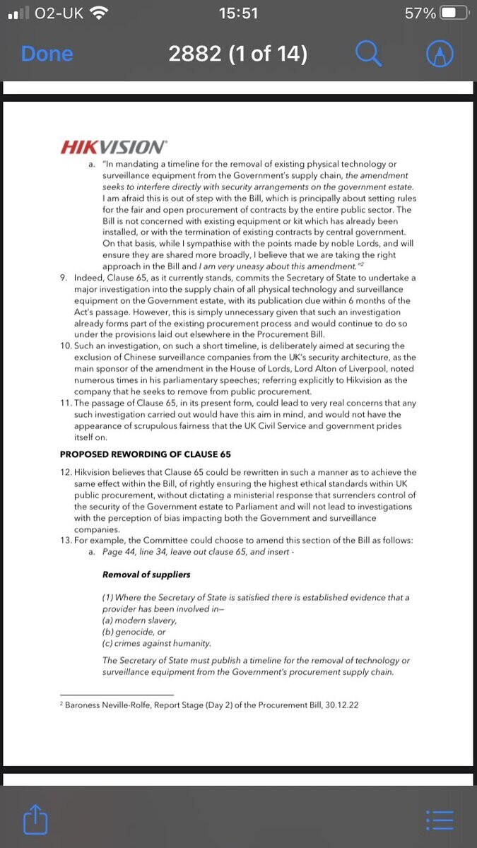 Conformation that Gov intends to remove the cross-party Alton amendment from #ProcurementBill which would require publication of a timetable to remove #Hikvision & #Dahua cameras from the procurement supply chain. These are both companies banned in USA for links to #Xinjiang. 🧵 https://nitter.hongkongers.net/SamGoodman22/status/1620366566859718656#m