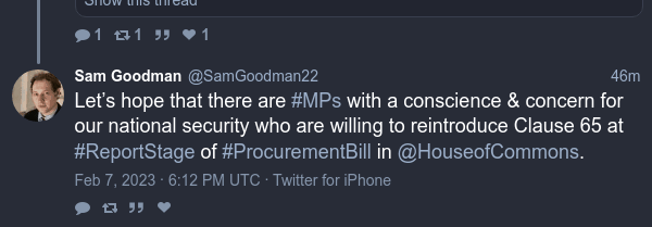 R to @SamGoodman22: Let’s hope that there are #MPs with a conscience & concern for our national security who are willing to reintroduce Clause 65 at #ReportStage of #ProcurementBill in @HouseofCommons. https://nitter.hongkongers.net/SamGoodman22/status/1623021910937280513#m