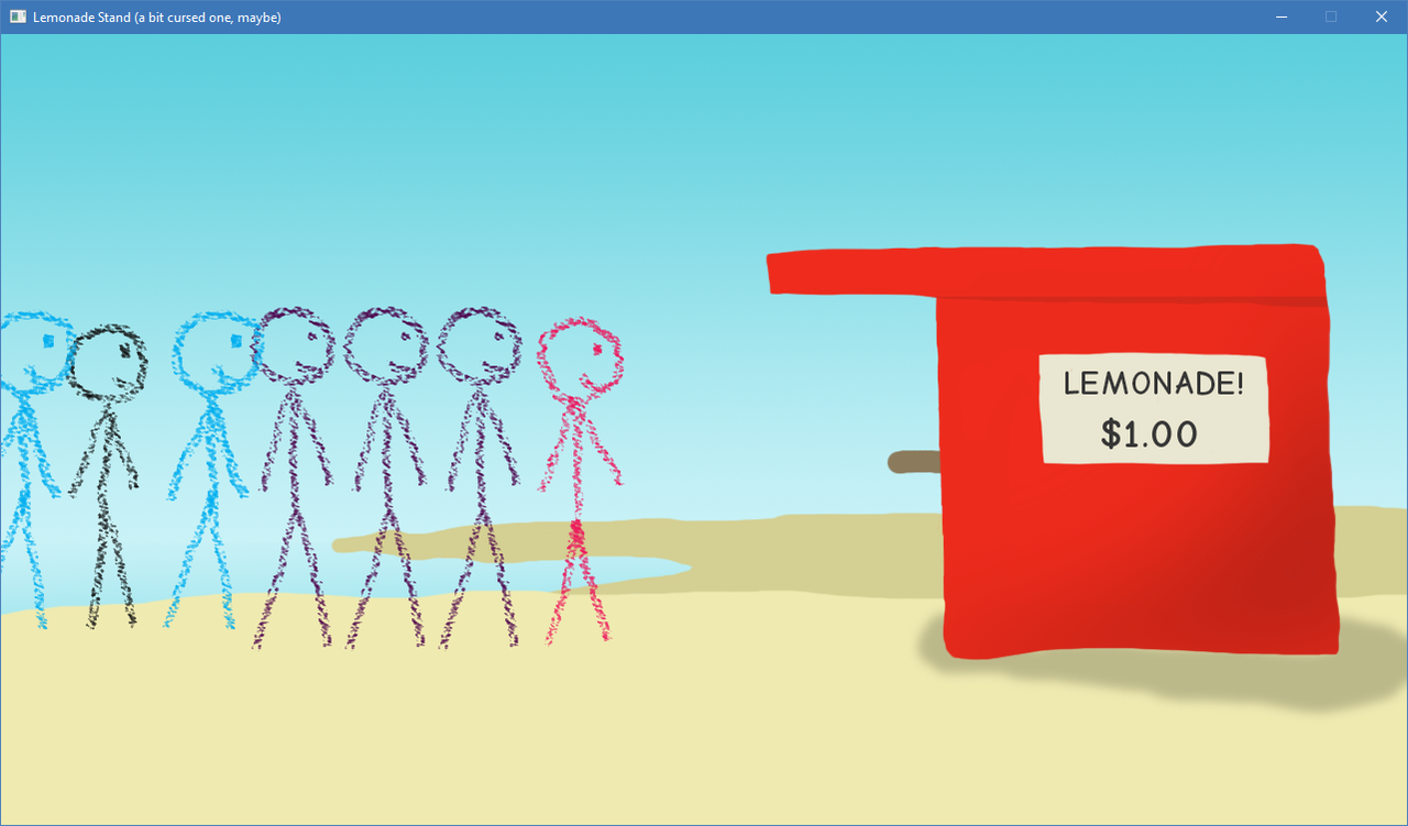 So I participated in Ludum Dare (theme: The more you have, the worse it is). Iām not happy with the result, but at least I got to balance a Lemonade Stand game and make some #programmerart. #LDJAM #LD40