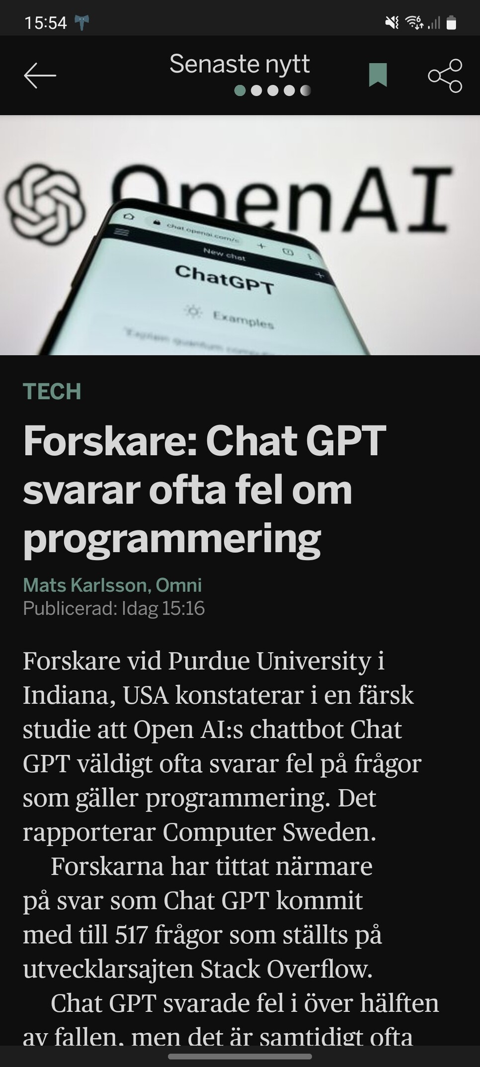 Chat GPT svarade fel i över hÀlften av fallen, men det Àr samtidigt ofta svÄrt att identifiera felen, hÀvdar forskarna. "