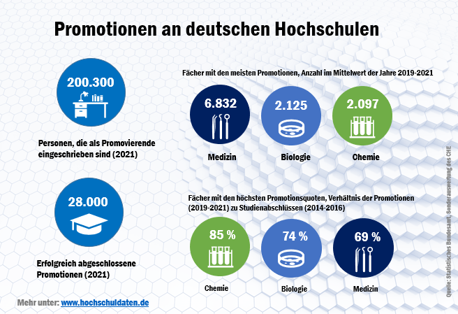 Promotionen stellen den höchsten zu erlangenden Studienabschluss an deutschen Hochschulen dar. Laut Statistischem Bundesamt waren im Dezember 2021 rund 200.300 Menschen in Deutschland als Promovierende eingeschrieben. Die Zahl der 2021 erfolgreich abgeschlossenen Promotionen lag bei rund 28.000.