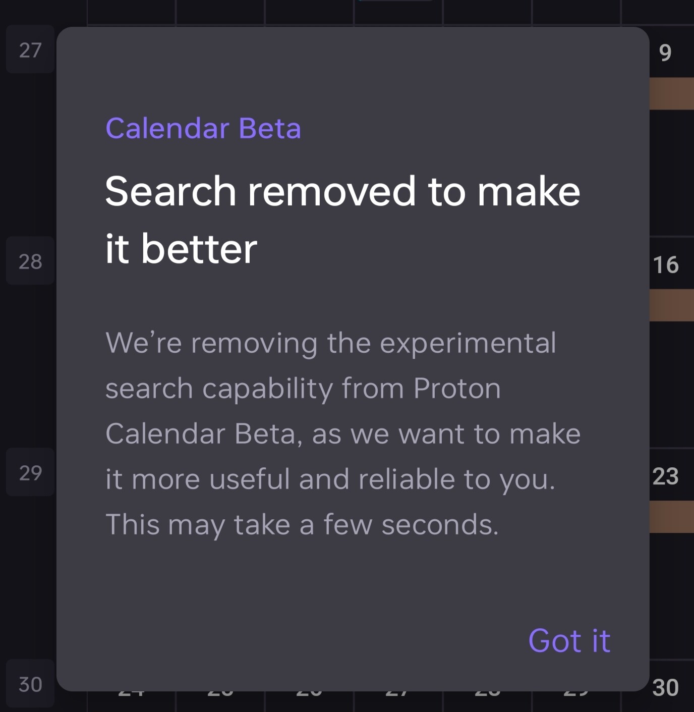 Bloody hell..! Proton have removed the Search from their Android Calendar app. Apparently an experimental feature but it was working fine for me - makes it much less useful to me now 😭.