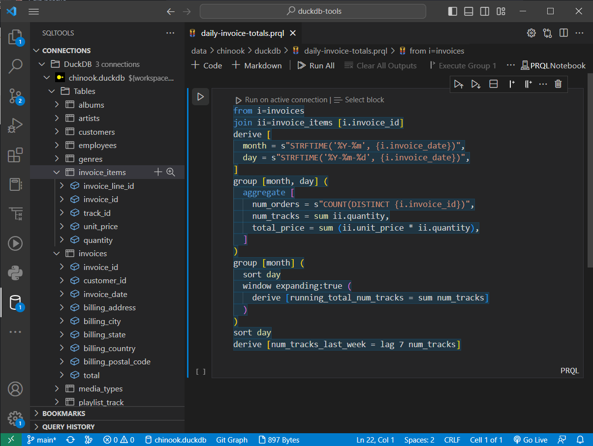 You'll be able to open any #PRQL file as a #DataNotebook π & Run PRQL query from a cell on an active #DuckDB connection in #VSCode.