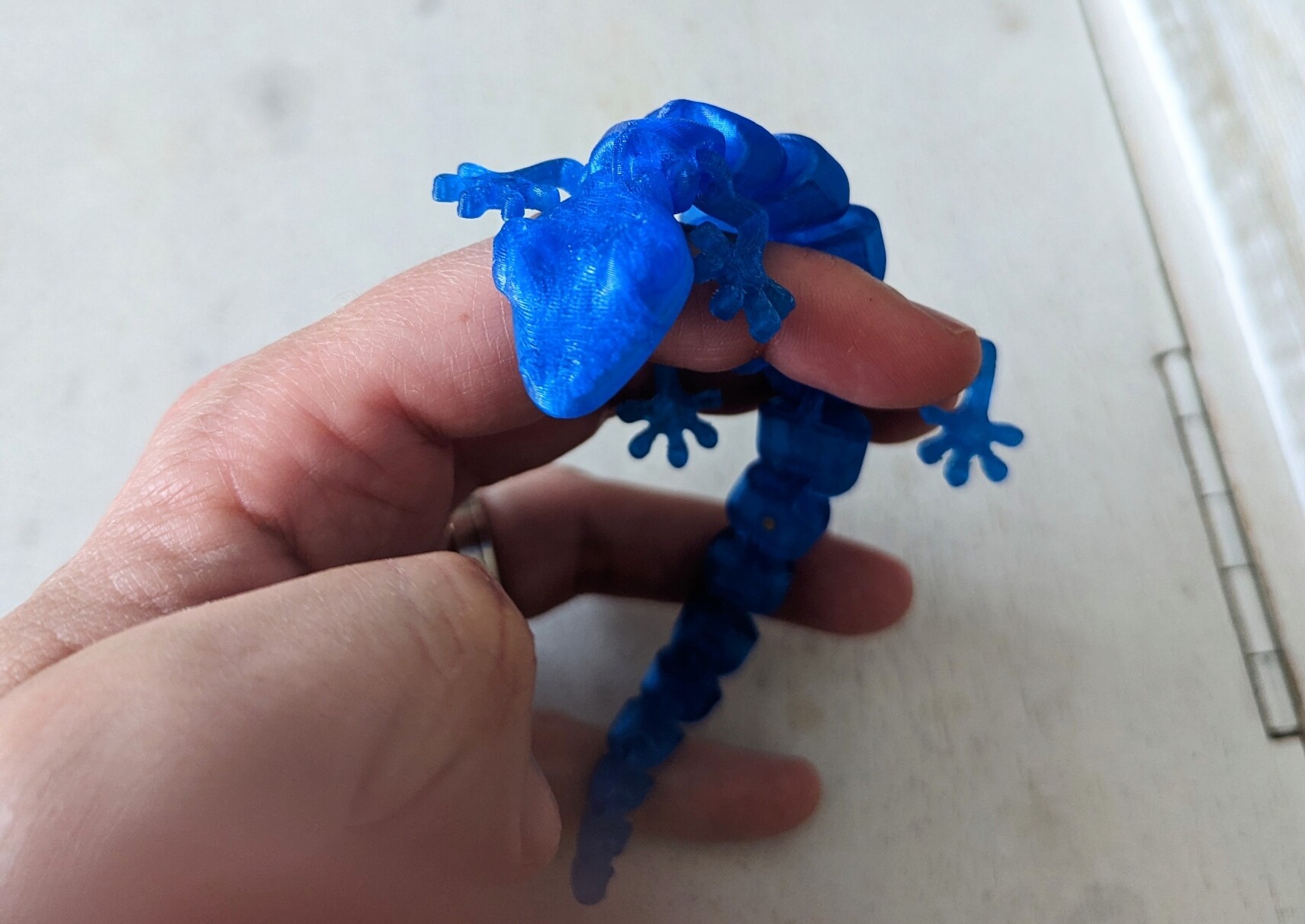 Mein Neffe hat einen Gecko bestellt und heute bekommt er ihn. Gedruckt habe ich ihn aus flexiblem TPU (85A) und in die Unterseite 4 Magneten eingeklebt, damit er zumindest ein bissl geckohaft am Kühlschrank kleben kann. 😉