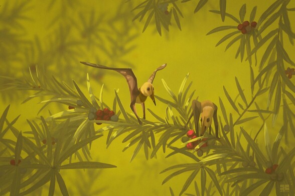 A painting I call Sinopteroberries, for #PterosaurPtuesday. Two juvenile Sinopterus eating some podocarp berries.