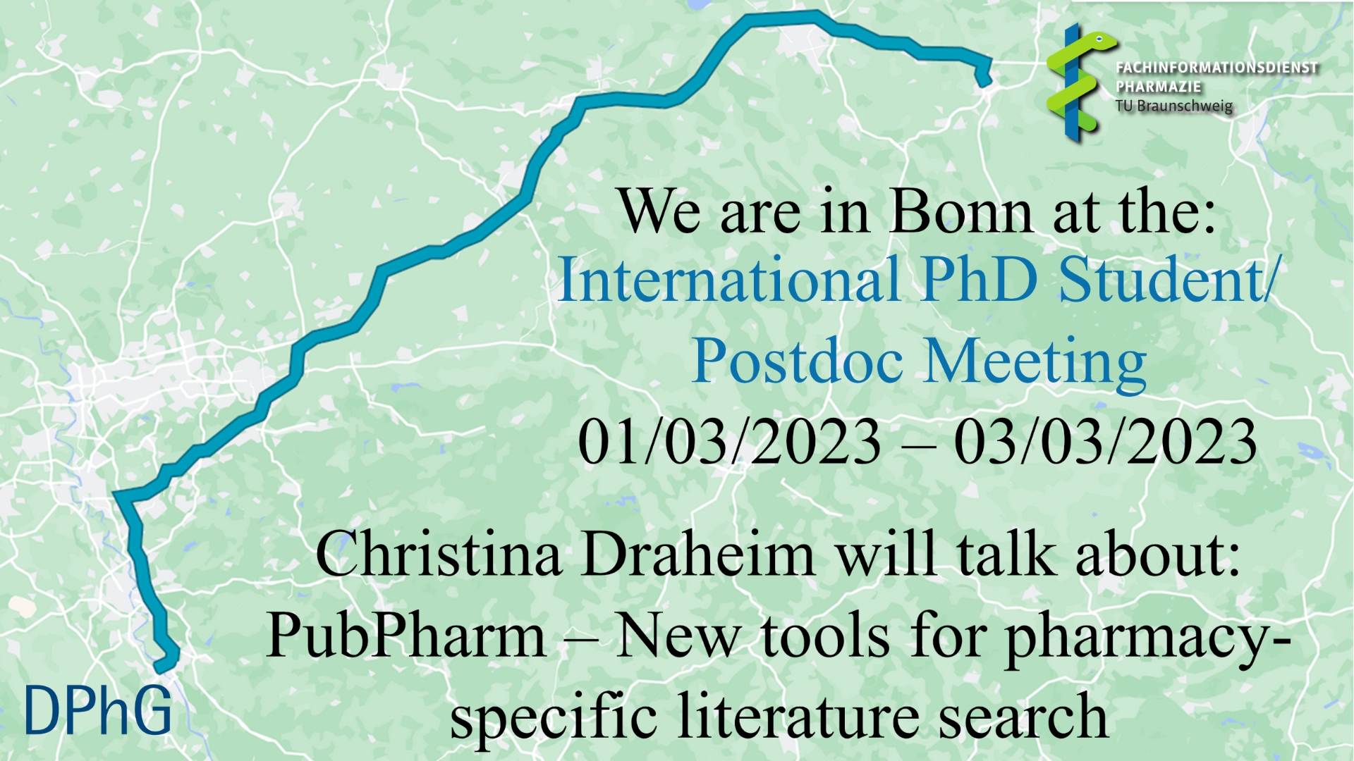 We are on the road again! Christina Draheim joins the International PhD Student/ Postdoc Meeting in Boon. She will discuss PubPharm as well as the close cooperation with @NFDI4Chem