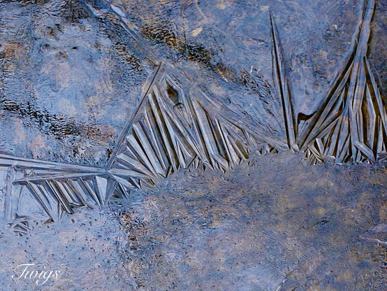 Took the hound for a walk in the woods where there are two fishing ponds. The surface was frozen solid and the ice patterns had formed. It looks like an impressionist painter had laid it down with a pallet knife to resemble mountain peaks. Long lozenge shaped ice crystals #ice #puddleart