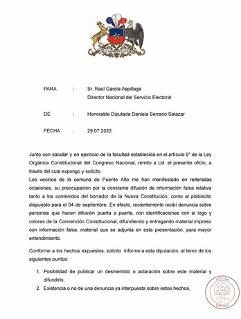 🔎Oficiamos al @ServelChile@twitter.com por las denuncias que recibimos de vecinos y vecinas de #PuenteAlto respecto a personas que difunden material impreso con información falsa sobre el contenido de la propuesta de nueva constitución y el plebiscito de salida.
