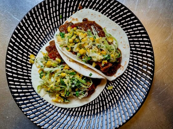 For the record, the corn & cabbage slaw contains about half a bunch of coriander (or "cilantro", if you insist), and is dressed with a vinaigrette made from #fermented tomatillos, fermented limes, fermented garlic, and olive oil - no need to add further seasoning, because the fermented goodies are already quite salty & sour. (Is there a Guinness World Record for using the word "fermented" in a single sentence?)