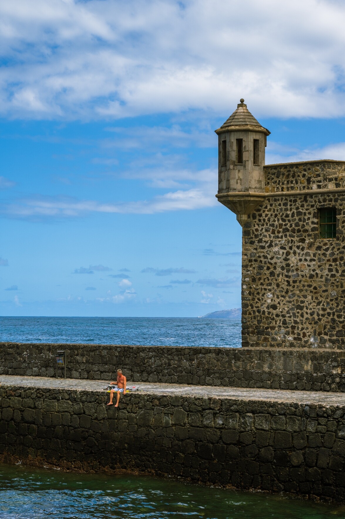 Man sunbathing on the sea wall of Bateria de Santa Barbara, Puerto de la Cruz, Tenerife