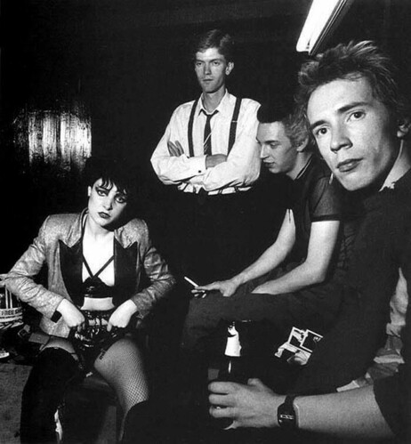 Siouxsie Sioux & Steve Severin, John Ingham (standing) and Johnny Rotten of the Sex Pistols as captured by Ray Stevenson in August 1976, after the “Screen on the Green” punk concert in Islington,