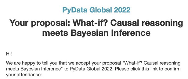 [What-if? Causal reasoning meets Bayesian inference] Talk accepted at #pydataglobal ! This will be my first talk as a professional data scientist with #pymc_labs 👨🏻💻📈 Watch this space for a special announcement soon…