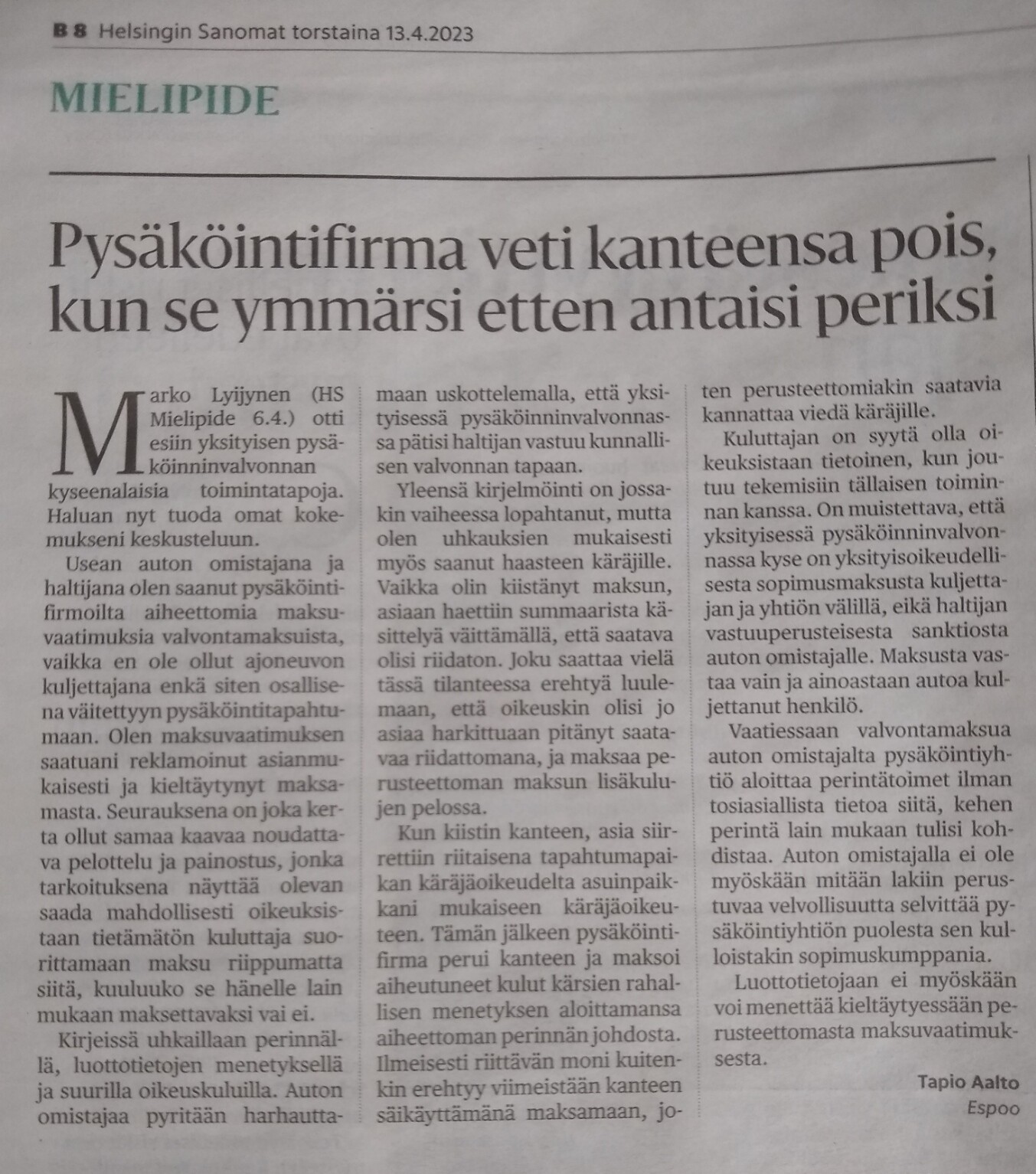 On kyllä varsin erikoista, miten nämä Parkkipate yms. firmat saavat tehdä näin laajamittaista kansalaisten painostusta ja pelottelua.