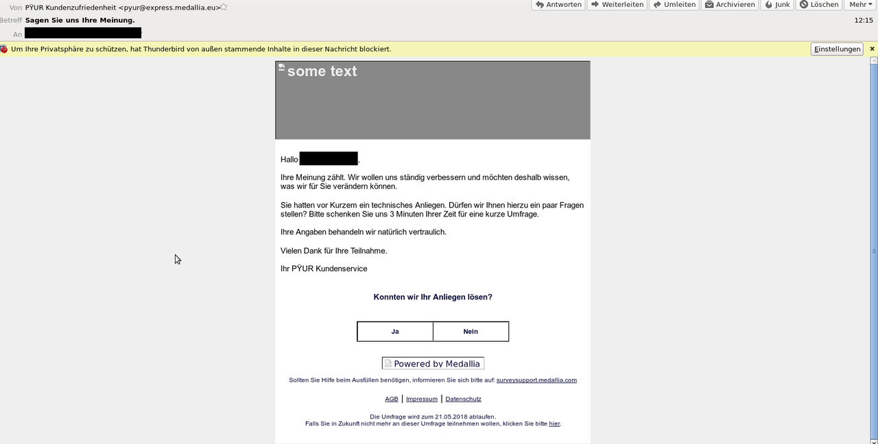 Hi. #Pyur. Ich klicke auf keinen der Links. Sorry, aber das Ding kommt nicht von einer (at)pyur Mailadresse und die Alternativtexte sind grausam. Woher soll ich wissen, dass das tatsächlich PYUR gesendet hat?