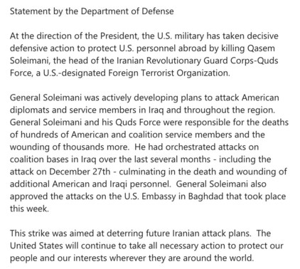 It is being reported that the Iraqi PM said that General Soleimani' was their guest, and the US strike was illegal. Calls also being made for the US embassy in Baghdad to be closed & troops to be removed from the country