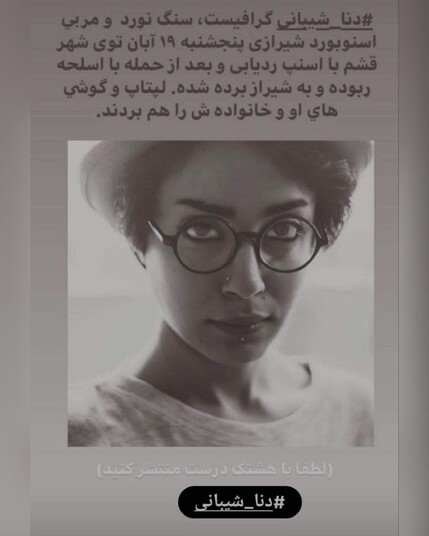 Mountaineer and snowboard instructor #Dena_Shibani was arrested in #Qeshm on Thursday, November 10, and transferred to #Shiraz. No information is available about the reasons for the arrest and her current whereabouts.