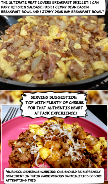 The Ultimate Meat Lovers Breakfast Skillet. You got your sausage, you got your bacon, you got your ham cubes, kicked up a notch by a variety of fried potatoes. Top with a proper amount of cheese and you literally have an appetite for (personal) destruction.