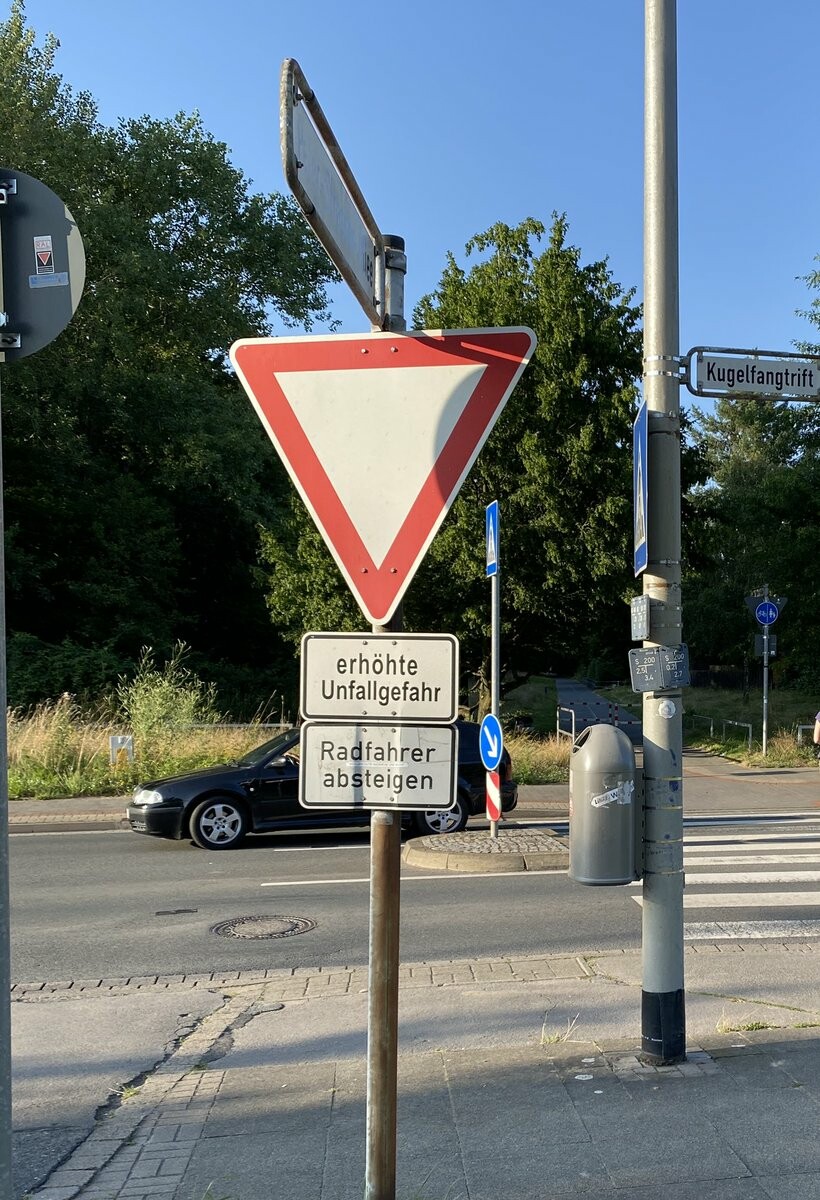 Bernd Sluka hat hier versucht das unlogische Schild #RadfahrerAbsteigen logisch hergeleitet einzuordnen und hat dann daraus Handlungsempfehlungen für Radfahrende abgeleitet.