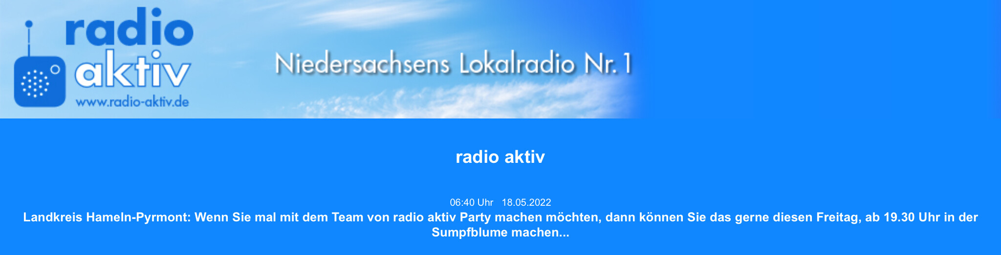 #radioaktivHM Da gehe ich (trotz des Beitrags 🙂) hin. Einladung: Landkreis Hameln-Pyrmont: Wenn Sie mal mit dem Team von radio aktiv Party machen möchten, dann können Sie das gerne diesen Freitag, ab 19.30 Uhr in der Sumpfblume machen... http://listen.radio-aktiv.de/beitraghoeren.php?id=38590